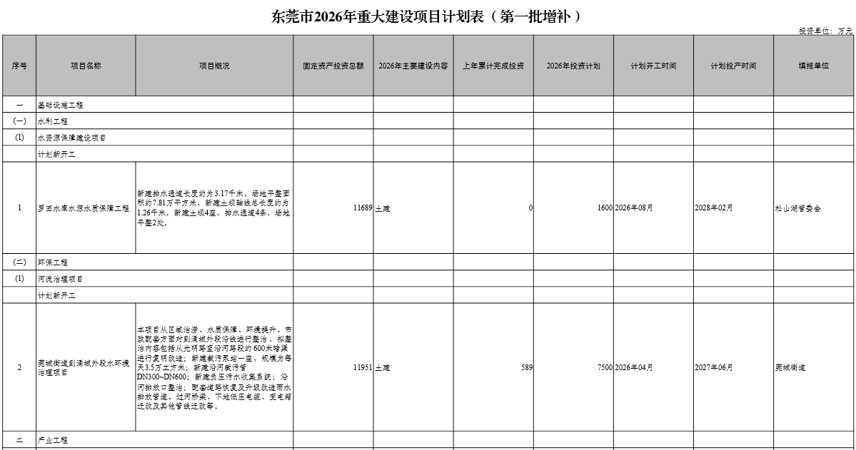 4月9日,東莞市發展和改革局印發東莞市2026年重大項目計劃(第一批增補)。經按程序審定,同意將廣東索艾智造總部項目等22個項目增補為2026年市重大建設項目,石排鎮西部專精特新產業園區首期道路工程等32個項目增補為2026年市重大預備項目。